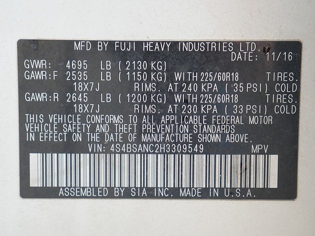 2017 Subaru Outback 2.5i Limited AWD, CVT Lineartronic, 2.5L 4-Cylinder DOHC 16V, 4D Sport Utility, Crystal White Pearl, Warm Ivory w/Perforated Leather-Trimmed Upholstery, 4.111 Axle Ratio, ABS brakes, Adaptive Cruise Control, Brake assist, Electronic Stability Control, Eyesight & Navigation & HBA & RAB & HID Lights, Four wheel independent suspension, Front anti-roll bar, Lane Departure Warning System, Popular Package #5, Pre-Collision System, Reverse Auto Brake, Security system, Speed control, Speed-sensing steering, Traction control, Wheels: 18 x 7.0 Aluminum Alloy w/Machine Finish.